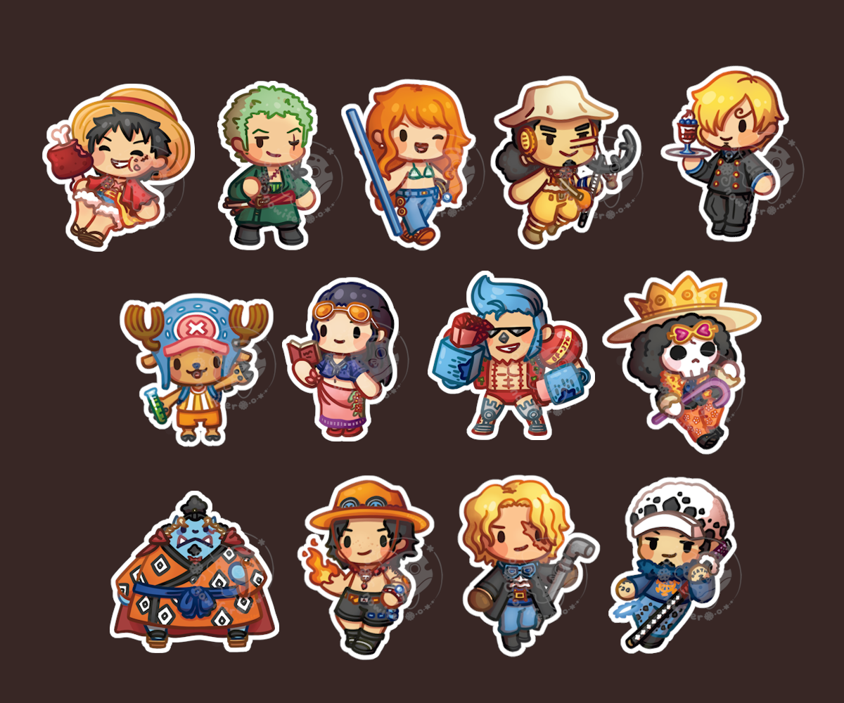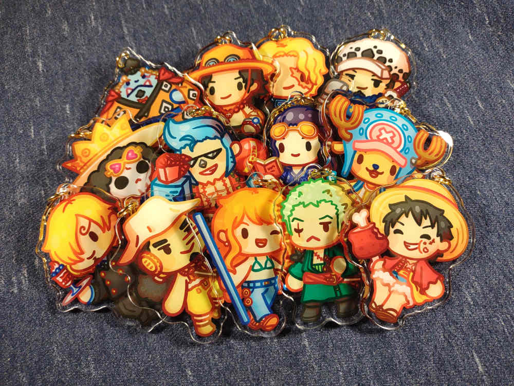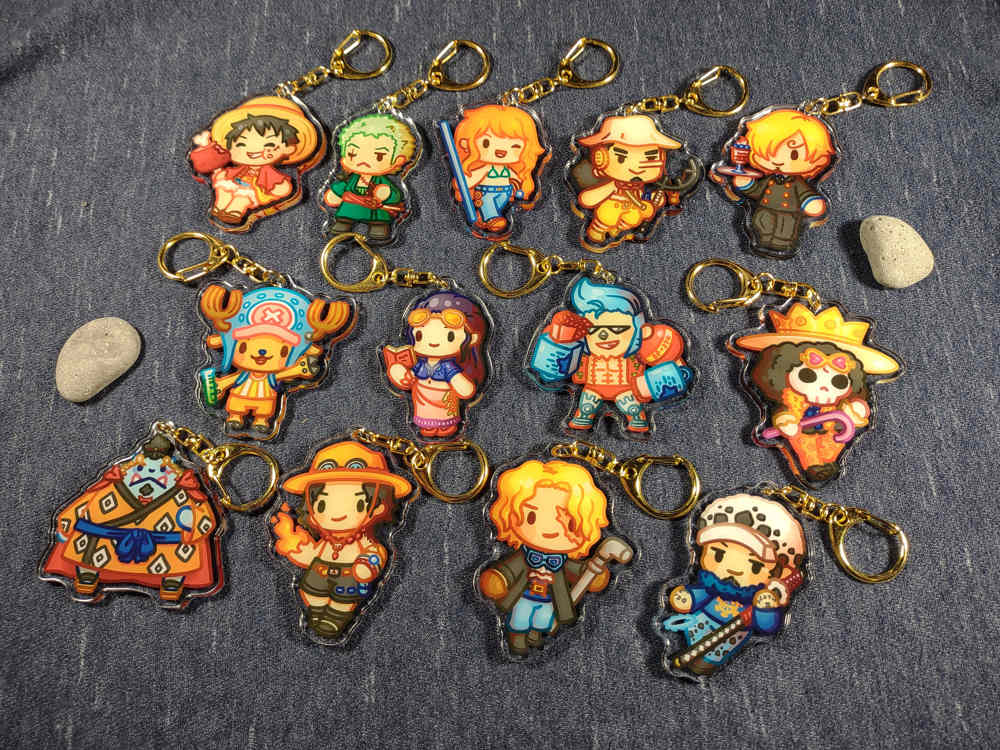 Chibi acrylic keychains of the characters from One Piece. Characters include Luffy, Zoro, Nami, Usopp, Sanji, Chopper, Robin, Franky, Brook. Jinbe, Ace, Sabo, and Law. The back side of each keychain has a different expression!
