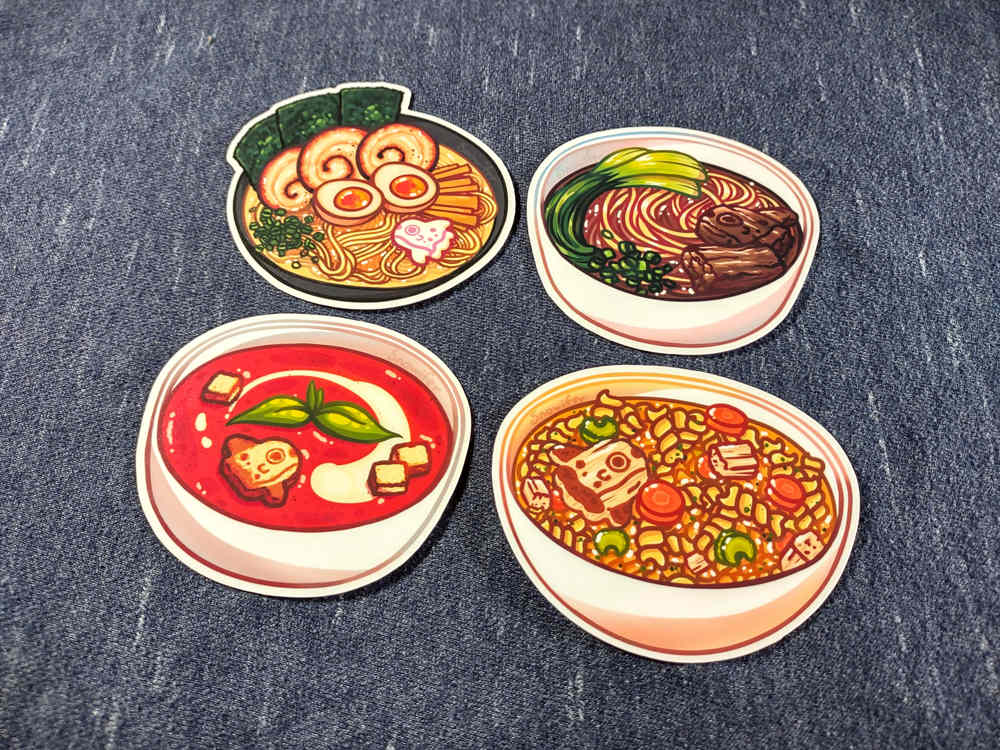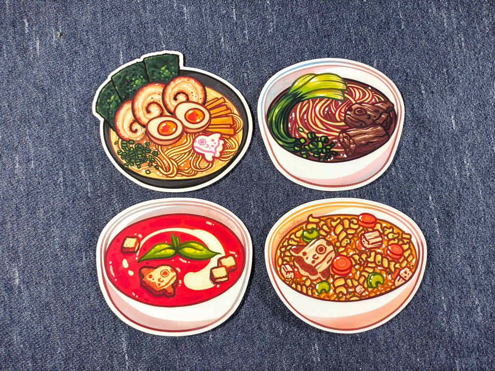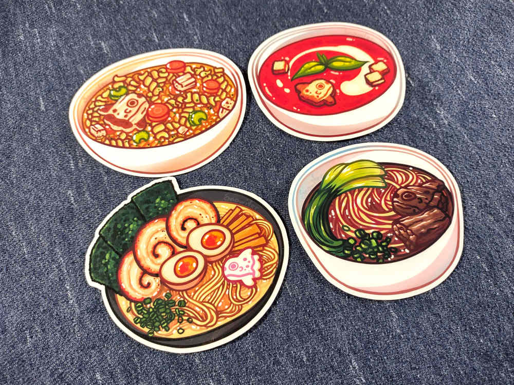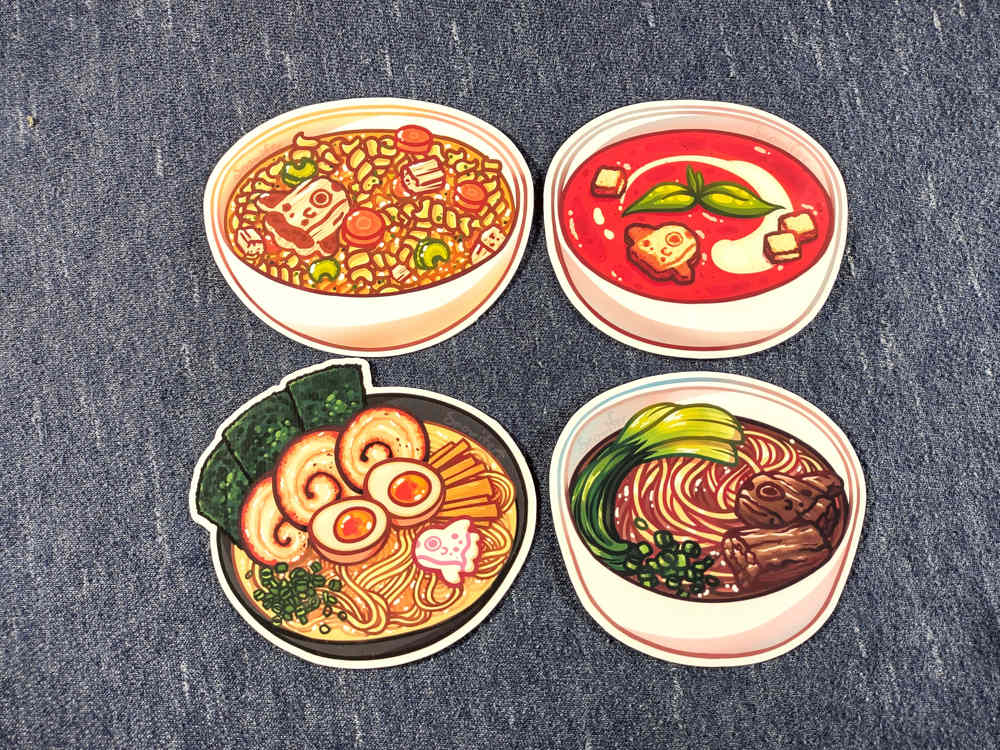Vinyl stickers of mola in different soups! Soups include chicken noodle, ramen, tomato, and beef noodle.