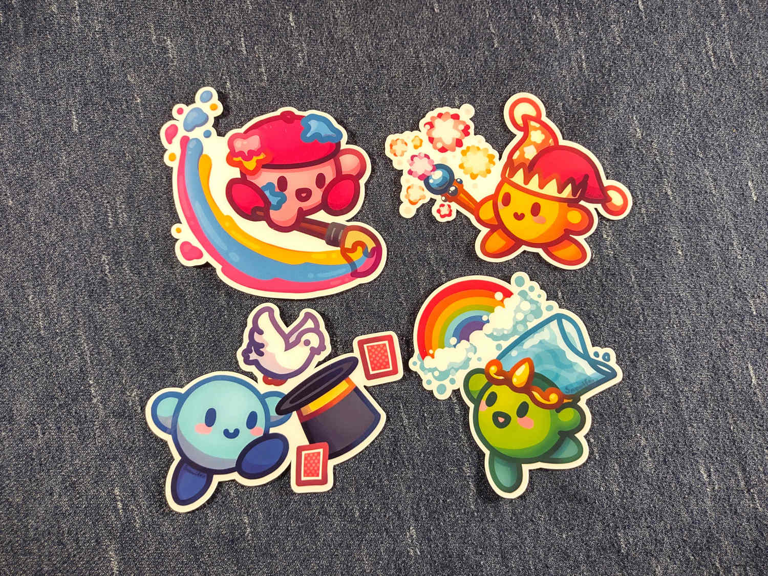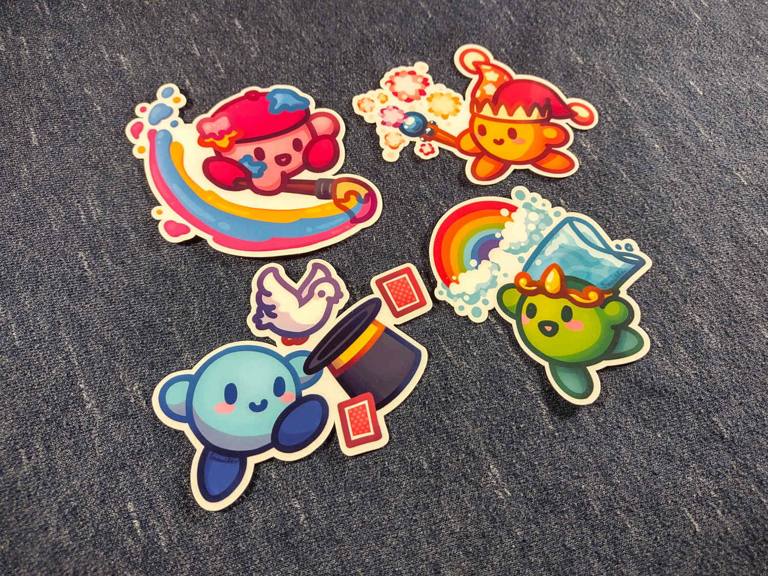 Stickers of various Kirby powerups! Featuring pink artist Kirby, yellow beam Kirby, blue magic Kirby, and green water Kirby.