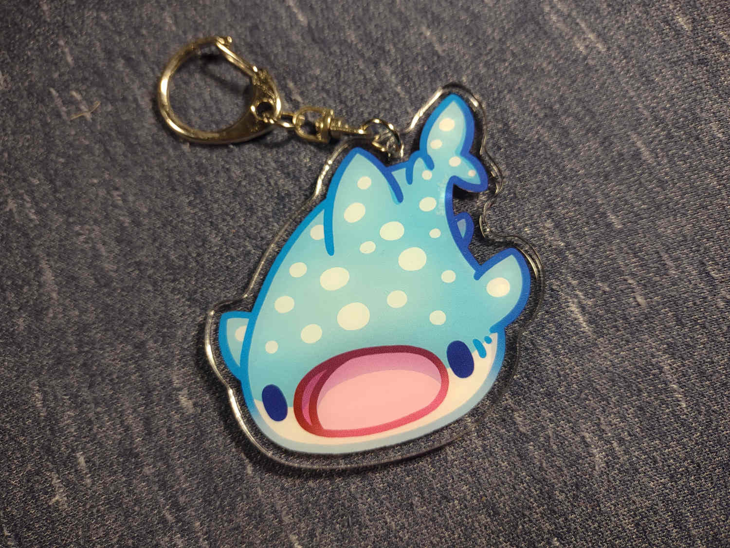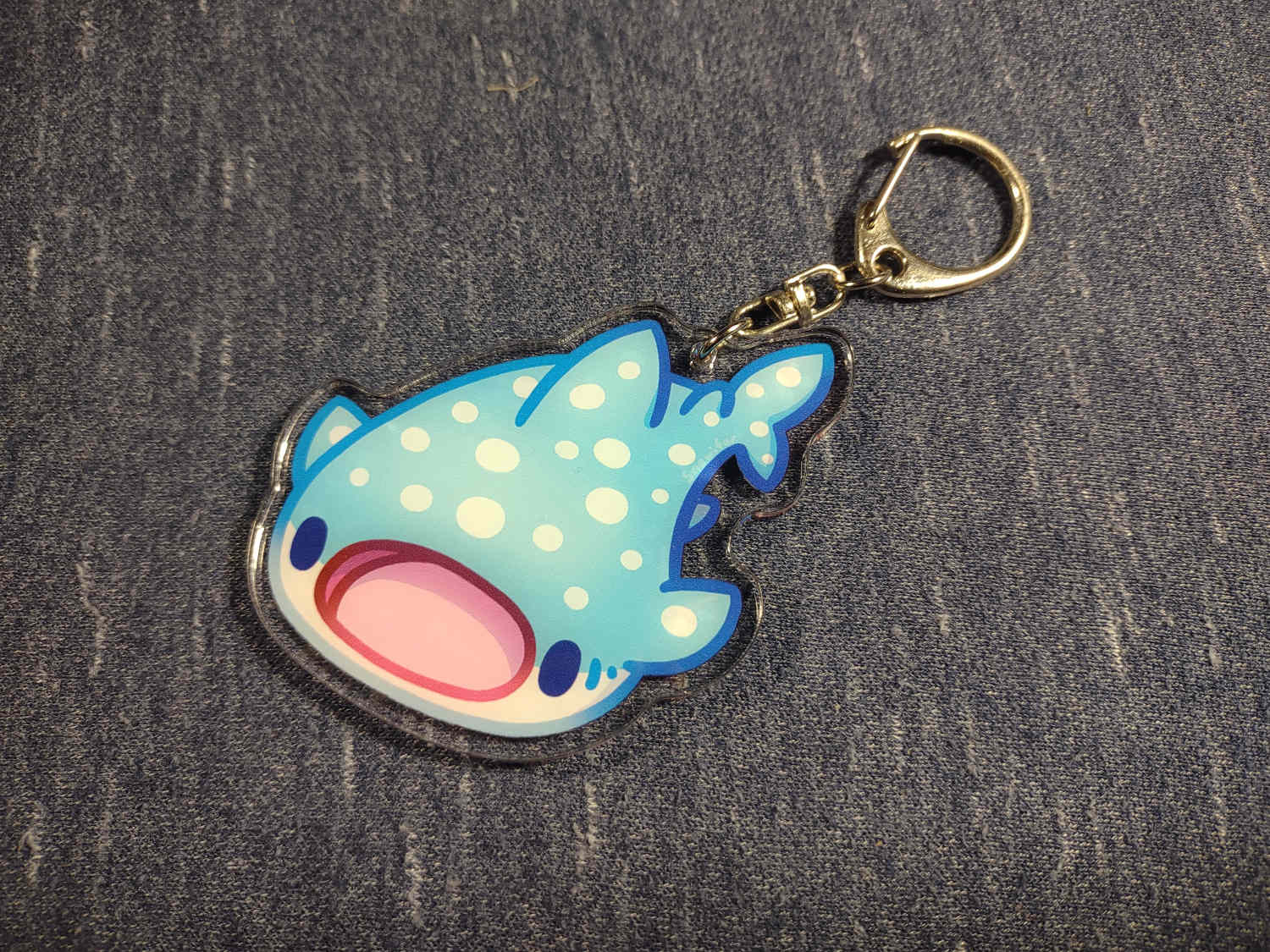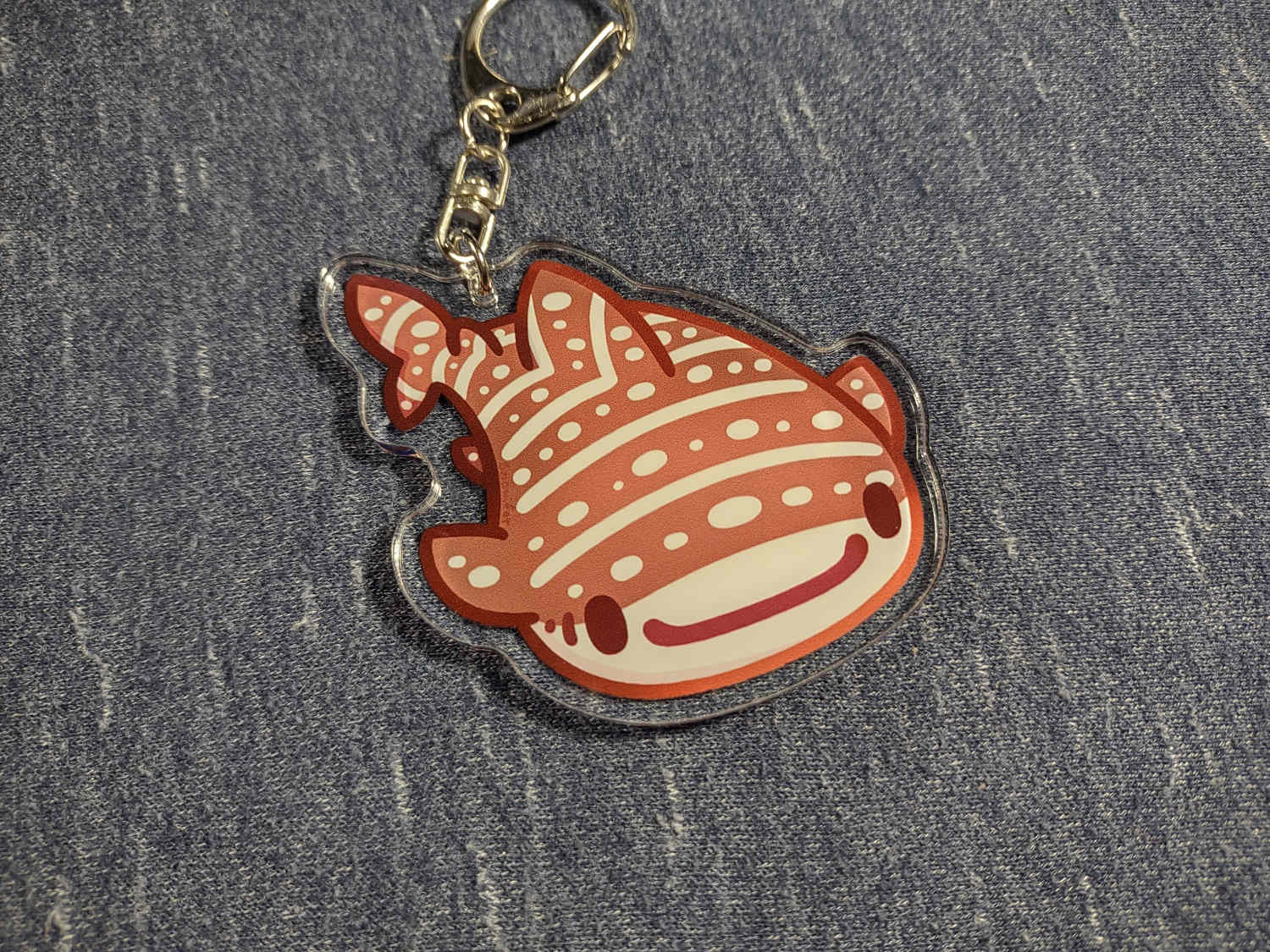 An acrylic keychain of a whale shark. The front is a light blue with white spots and the back is brown with spots and stripes.