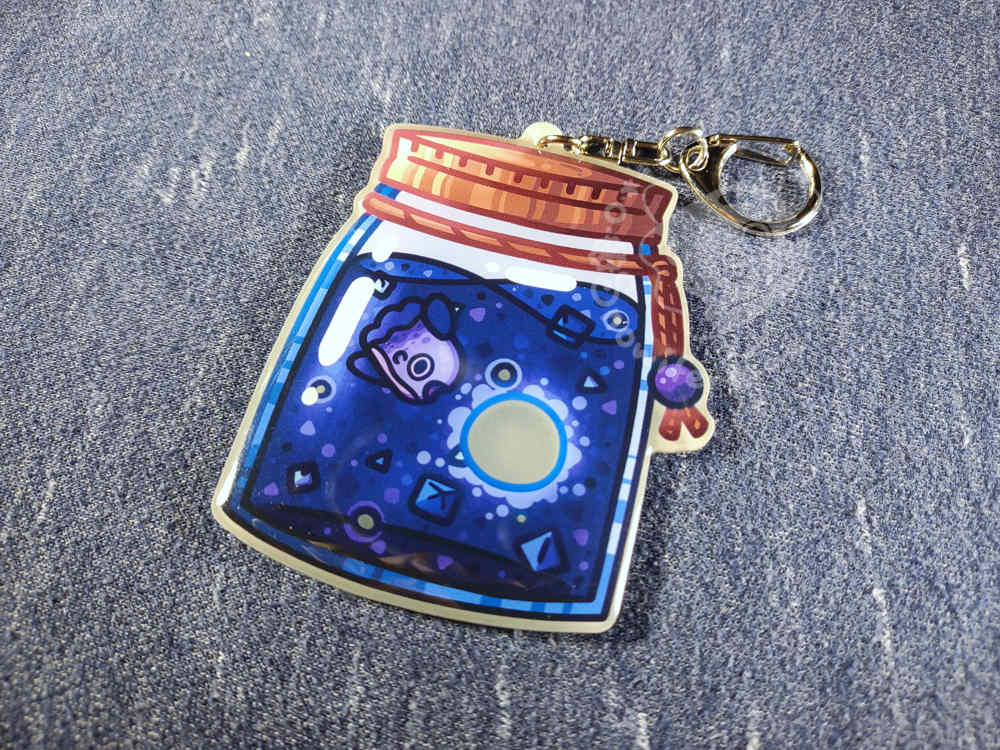 A blue glow in the dark keychain of mola inside a jar with dark purple liquid.