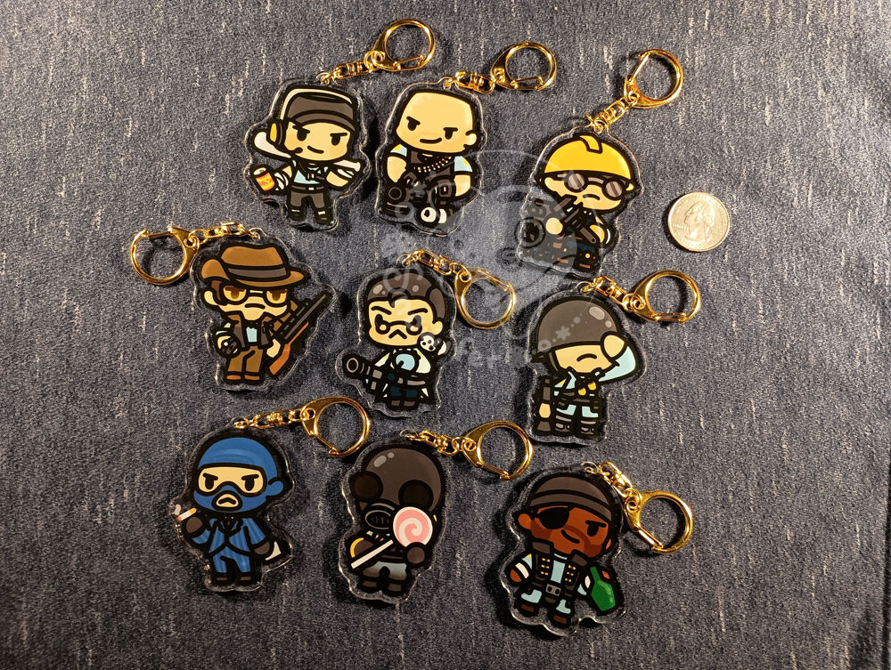 Chibi keychains of the TF2 classes. The front features the red team and the back the blue team.