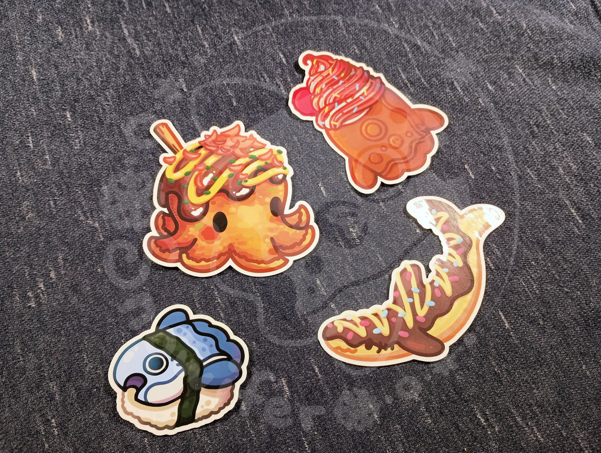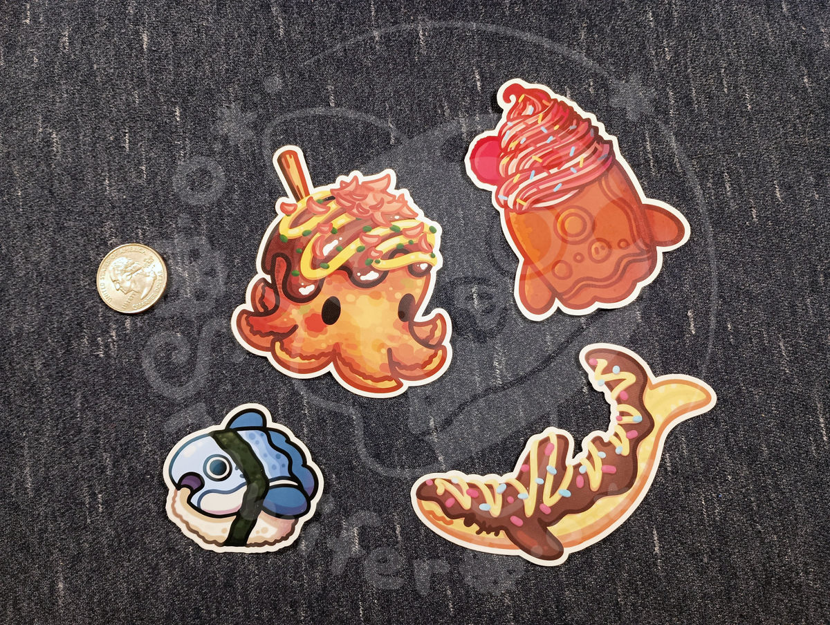 Various Japanese food inspired sea creature stickers. Including mola sushi, octopus takoyaki, mola taiyaki, and shark chocolate banana.