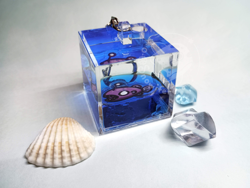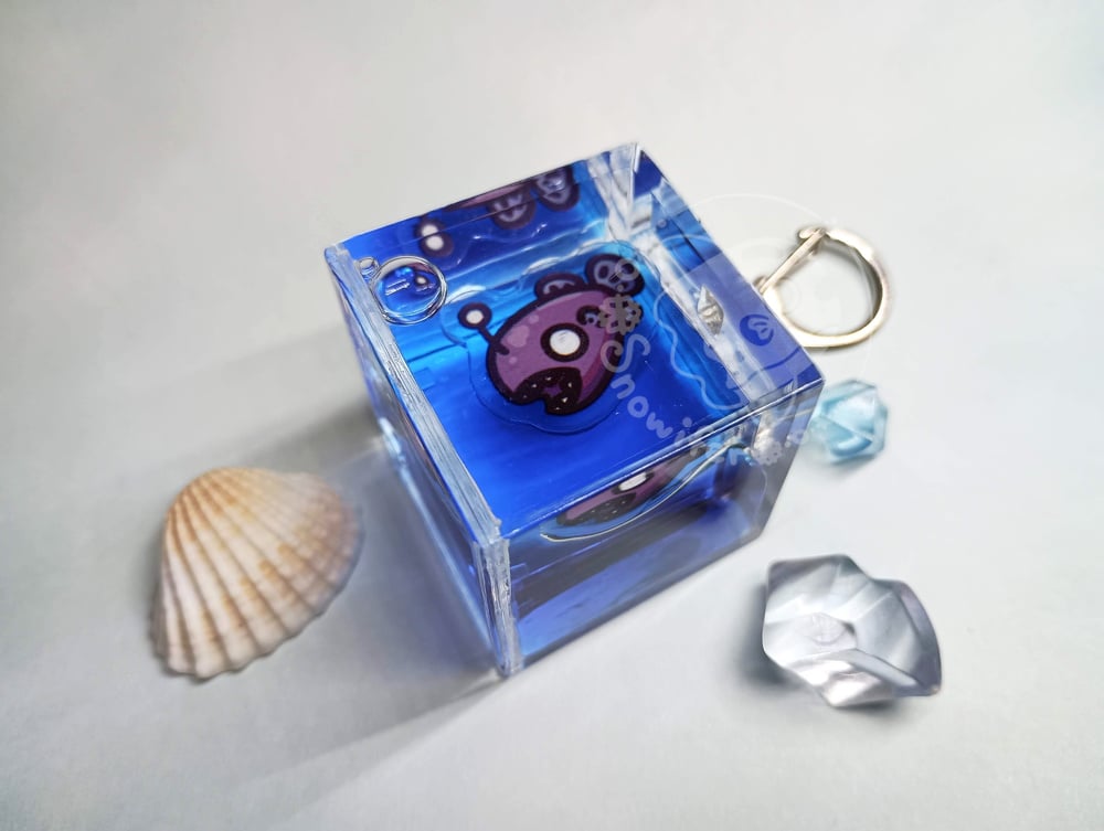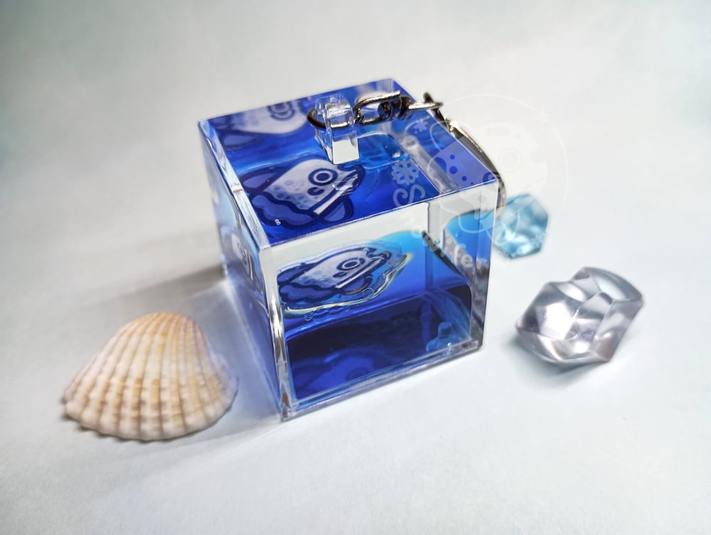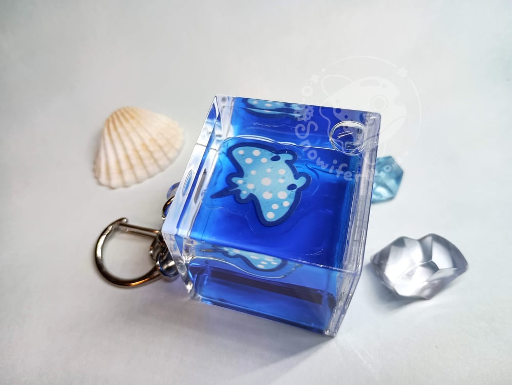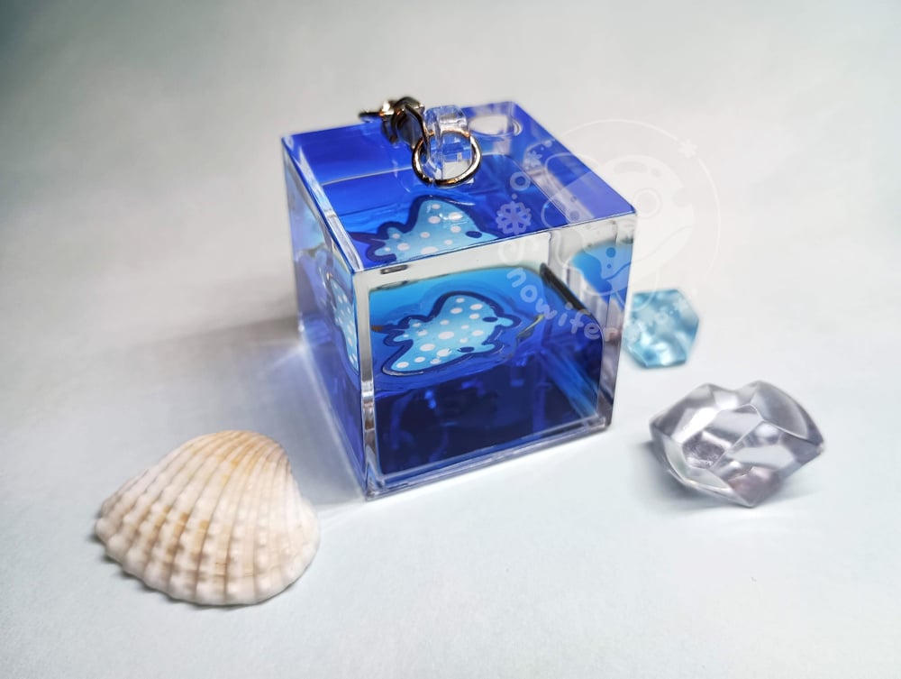 Cube keychains of various fish floating on water. Including mola, mantaray, and an anglerfish.