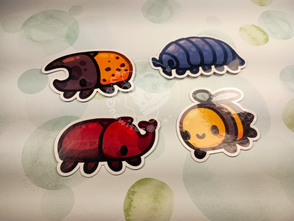 Cute stickers of various bugs including a bee, Hercules beetle, rhinoceros beetle, and a rolly polly.