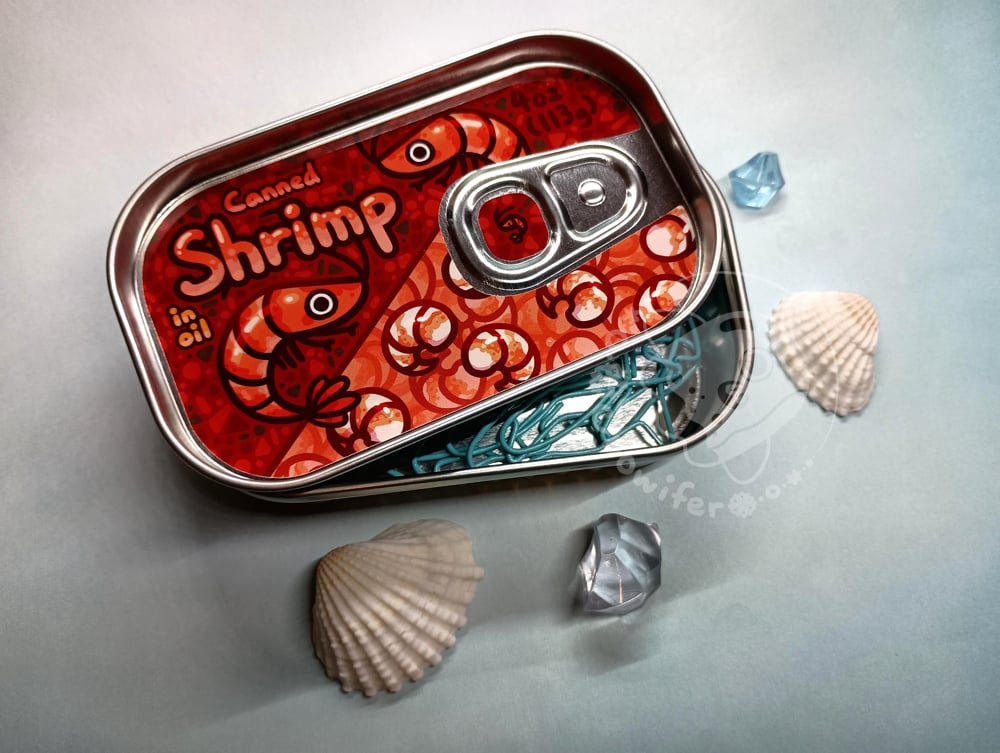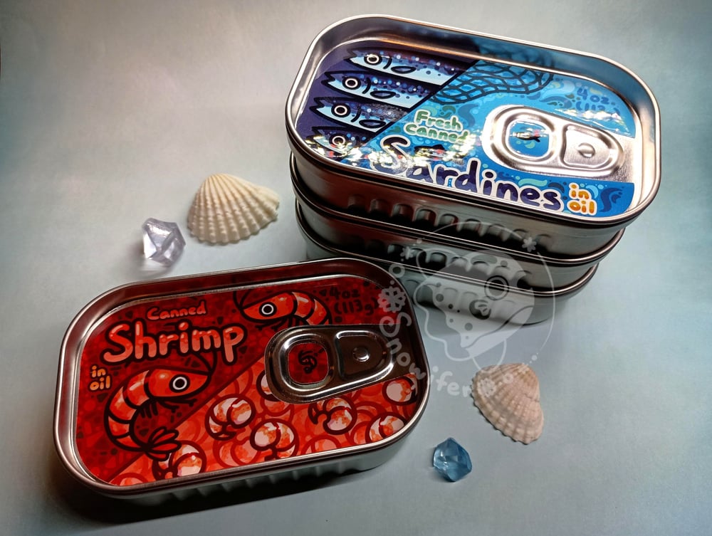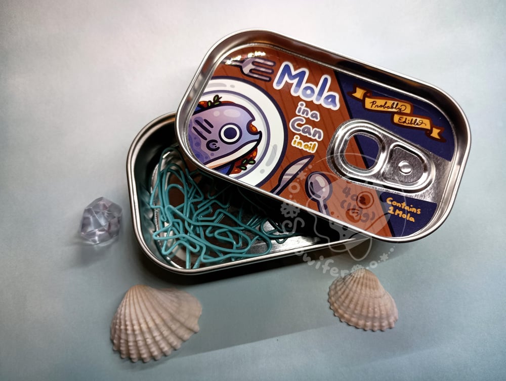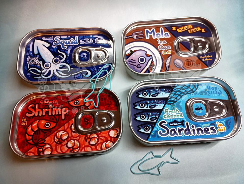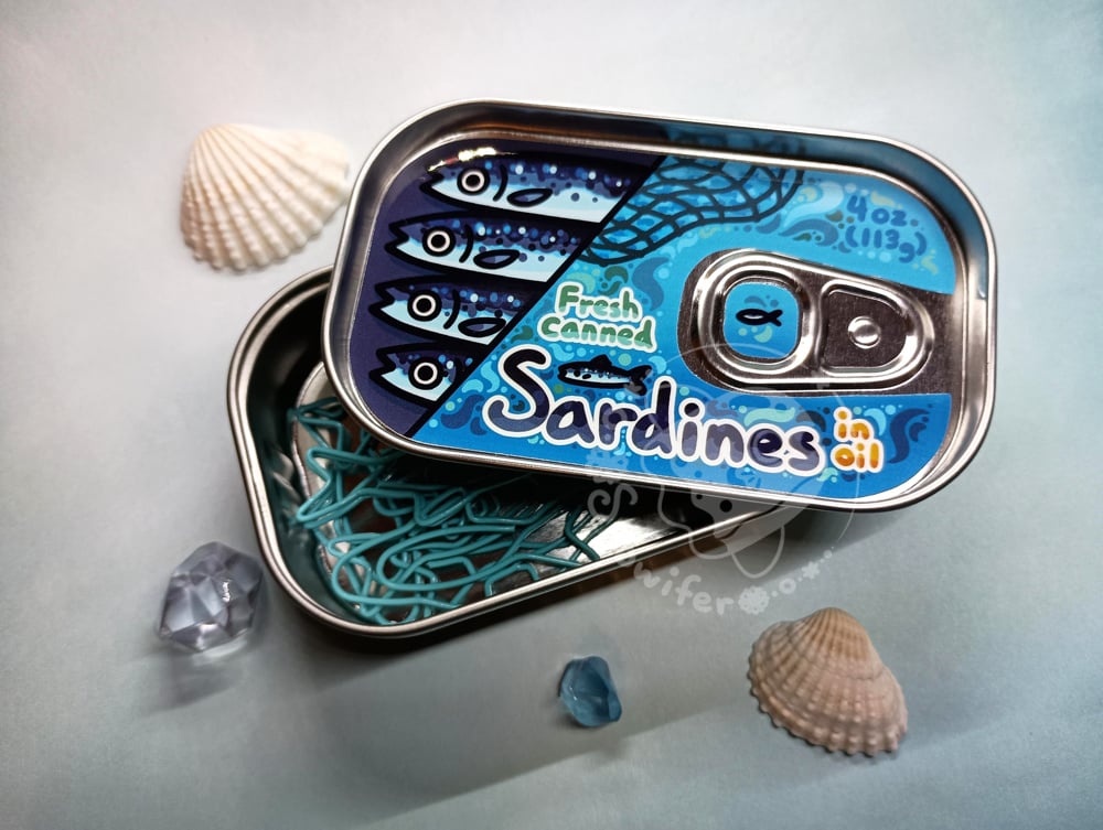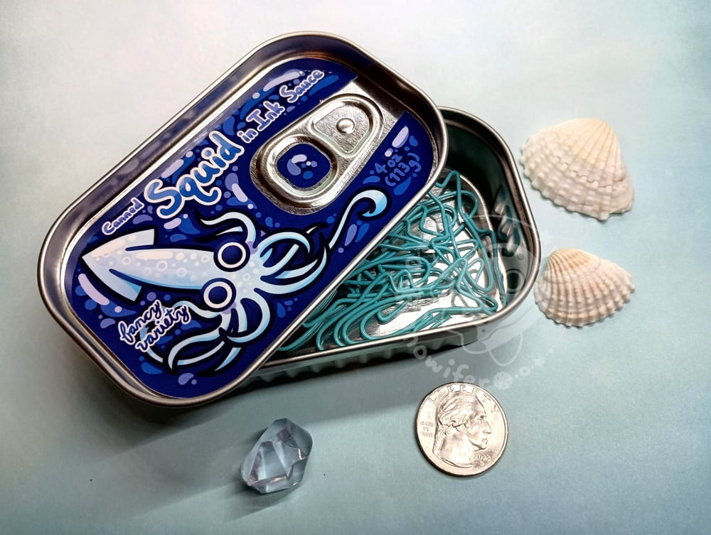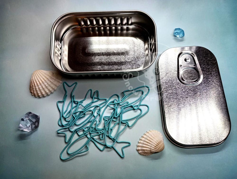 Metal tins featuring different canned fish. Each tin contains 10 blue fish paperclips. Be sure to pick which one(s) you want from the dropdown.
