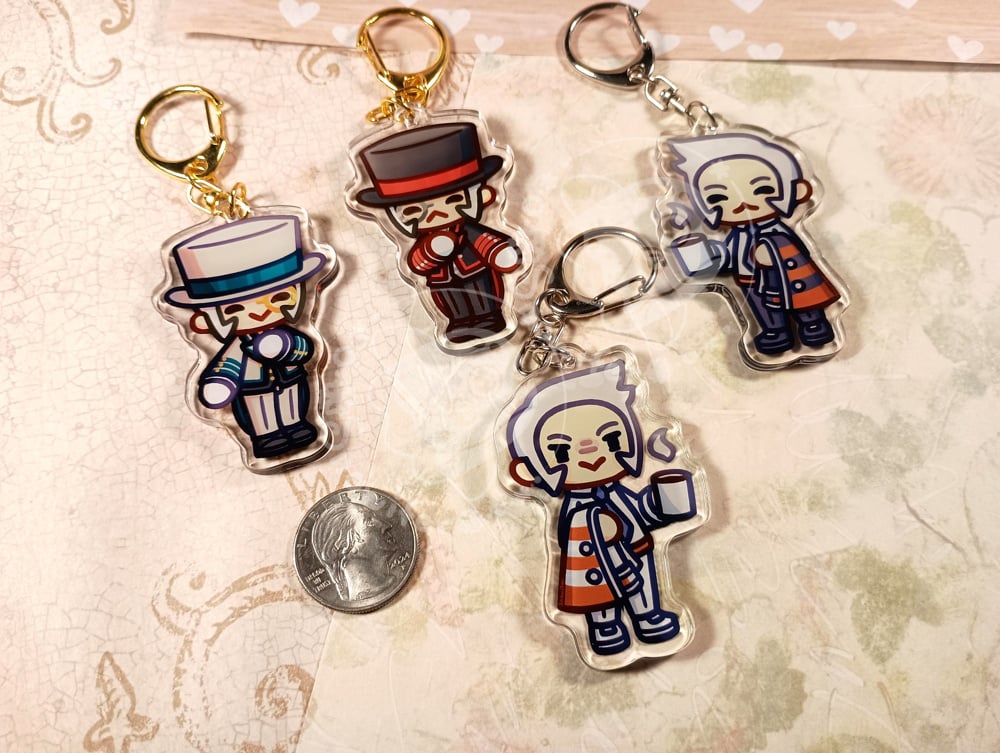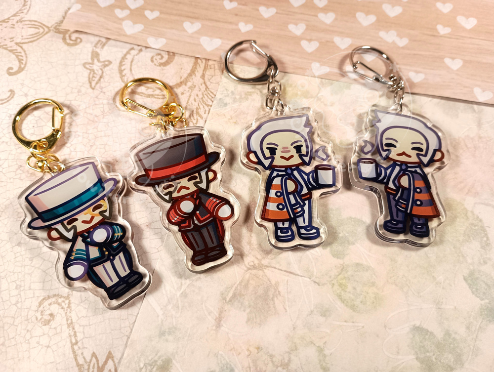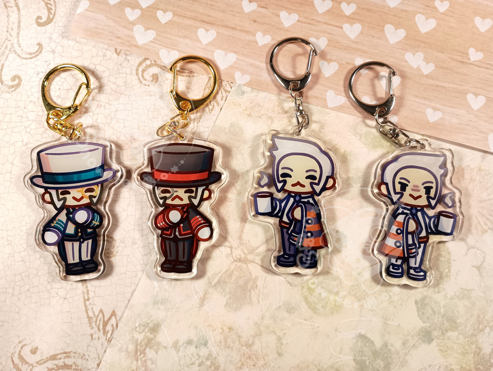 Keychains of the Subway Masters Emmet and Ingo in their tea party outfits or getting ready for work. Both keychains feature Emmet on one side and Ingo on the other.
