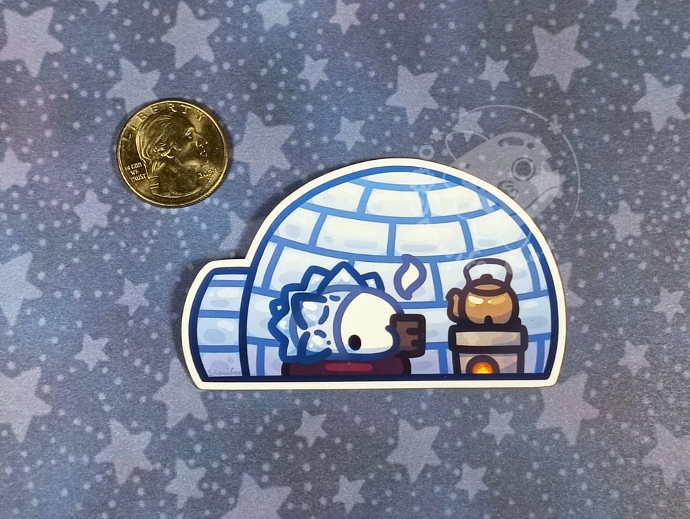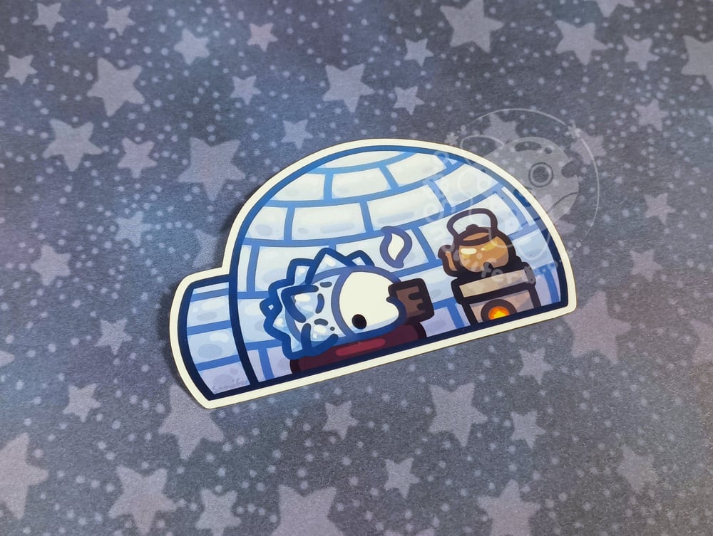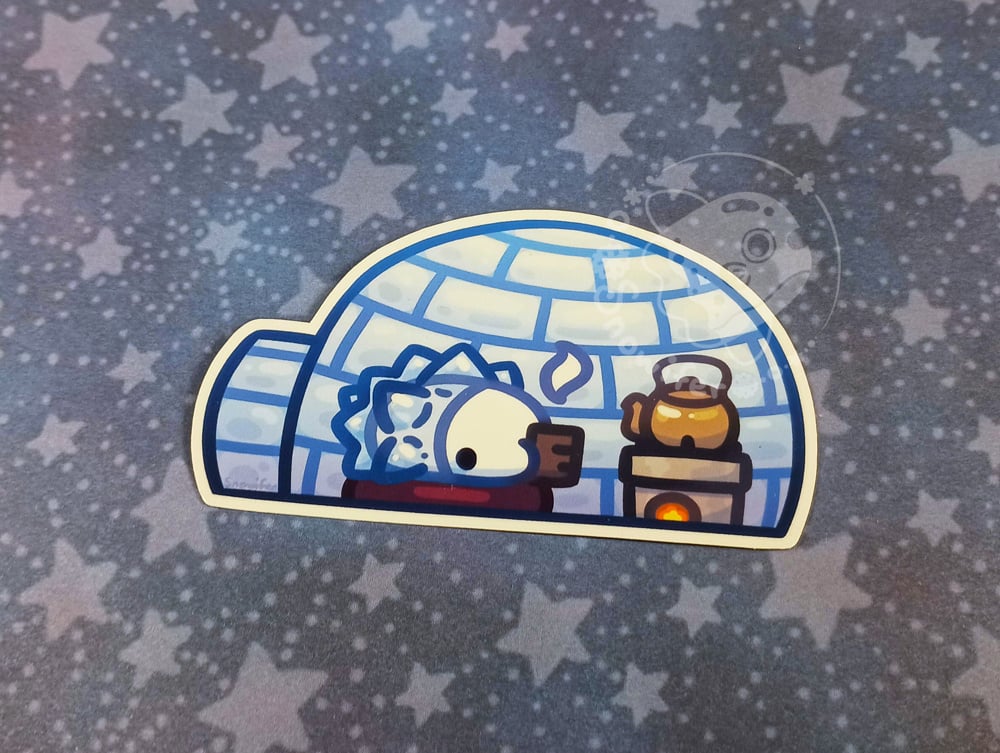 A sticker of a snom inside an igloo enjoying some tea.